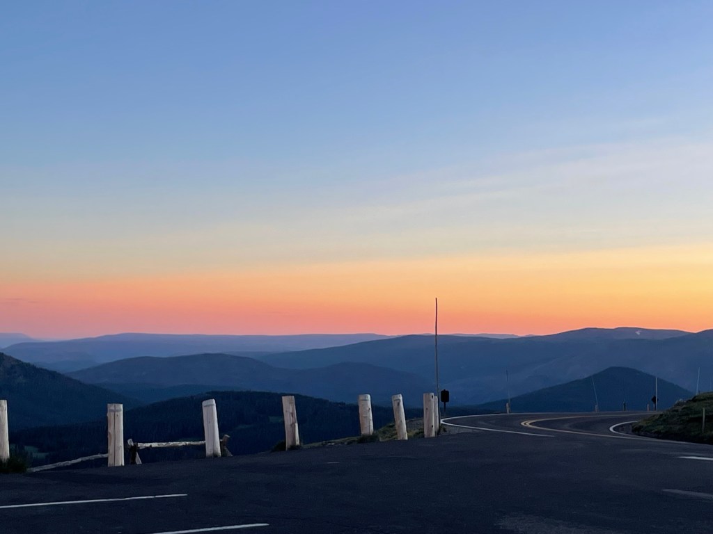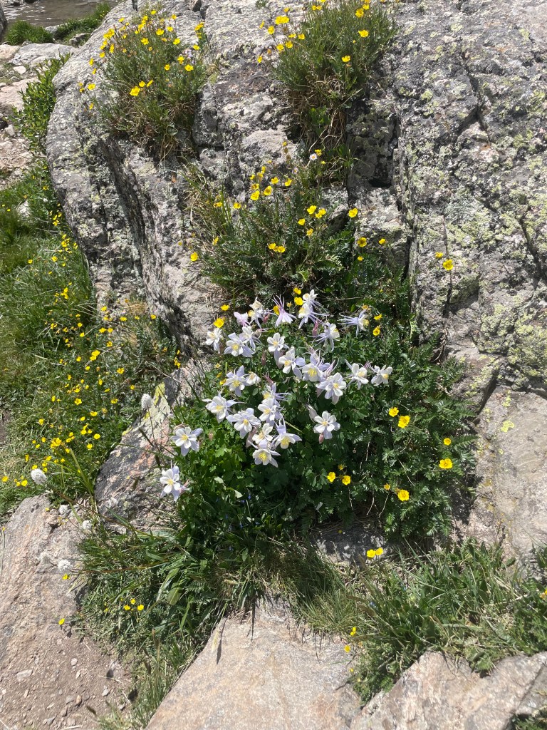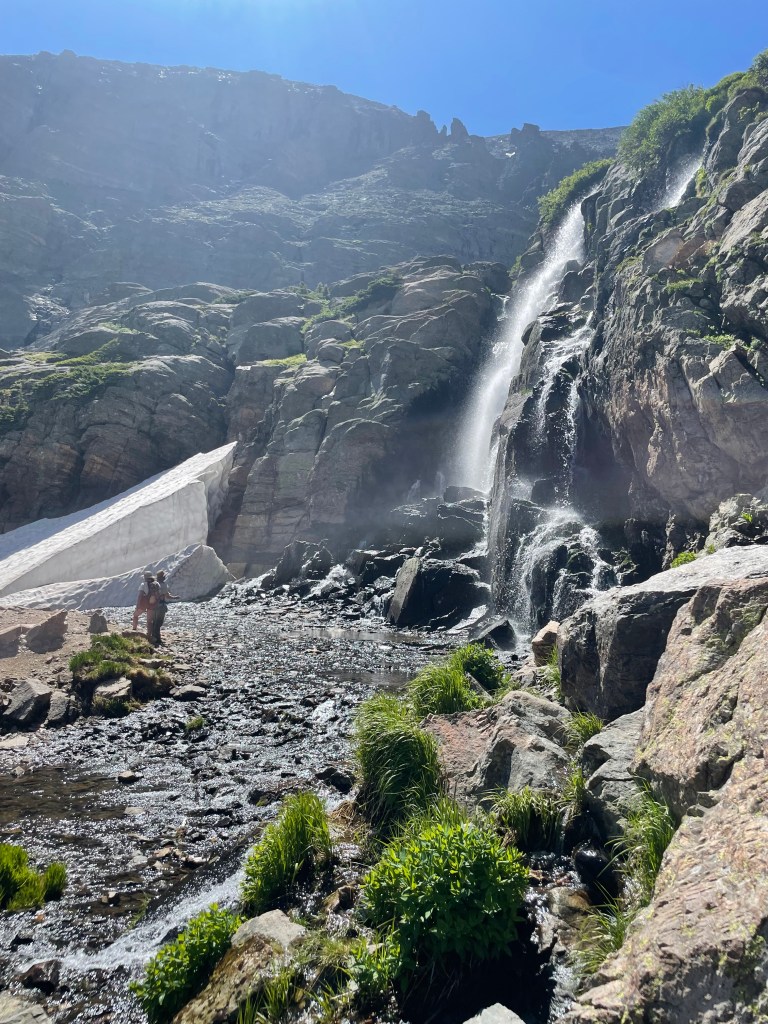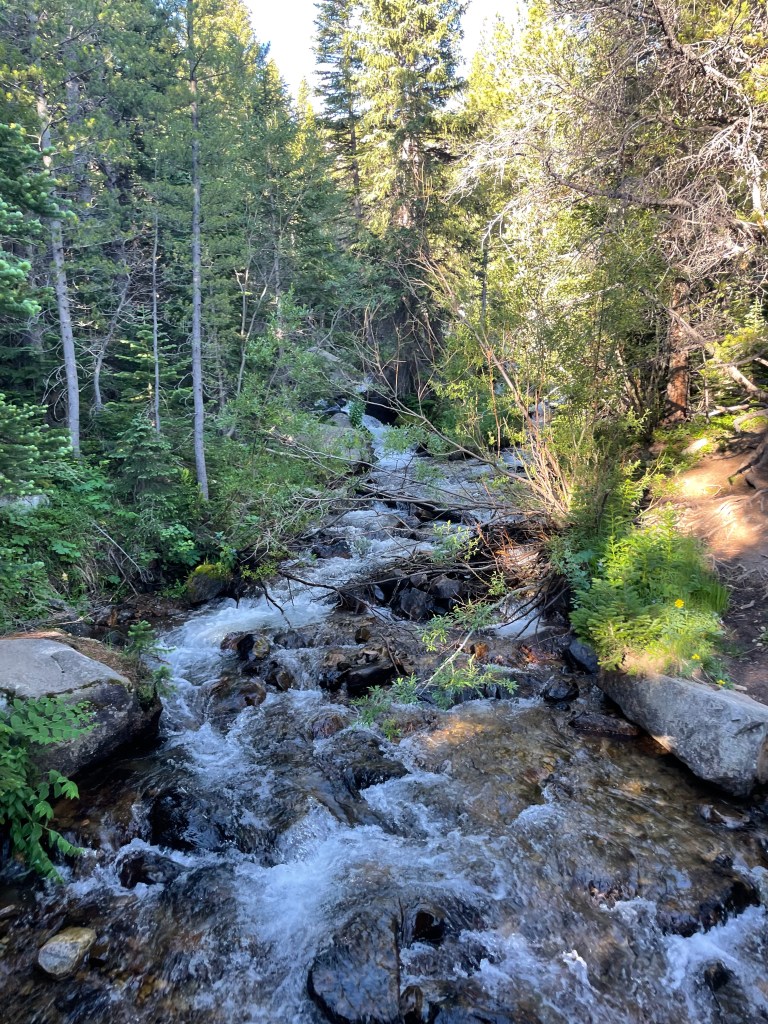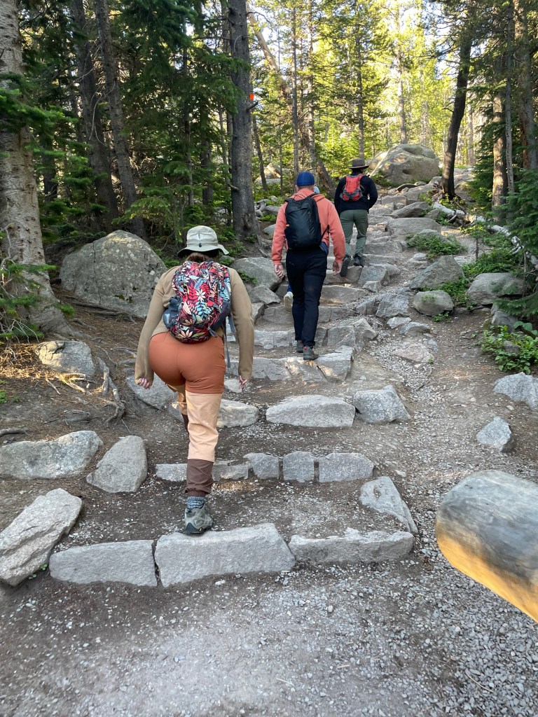 The 2 hour drive to the trail gave plenty of time to enjoy coffee and the sunrise and the views of Rocky Mountain National park . It was going to be a glorious day. This time also provided opportunity to research the details of the trail we would hike on the All Trails app. The 8 mile hike(actually turned out to be 10) would include views of mountain streams, beautiful lakes and several waterfalls. The Sky Pond hike was less popular then other hikes which we hoped meant less crowded. Many reviews also noted there would be a scramble portion on the last leg of the hike.