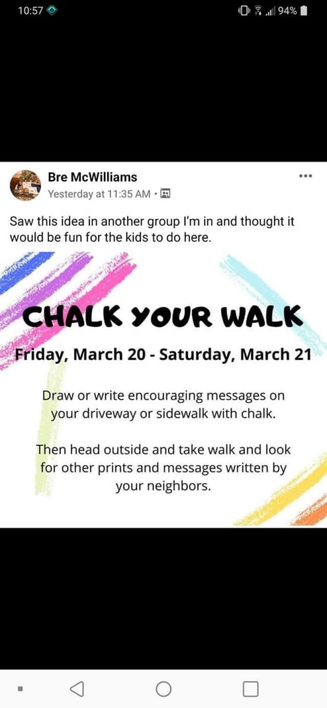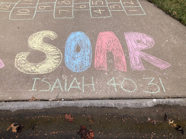 It was a group text to myself and 3 other neighbors. The above picture and the words, ” Let’s do this!” flashed across my phone screen. Within 30 minutes my neighbors and I and our families were outside on a beautiful Saturday sharing chalk and decorating driveways. It felt like therapy as Brooke and I created and colored and filled our blank driveway with a bible verse and 66 step hop scotch trail that lead to our door. It was a welcome escape from the last 7 days that had felt like 700. In a world gone crazy – this was exactly what the doctor ordered.